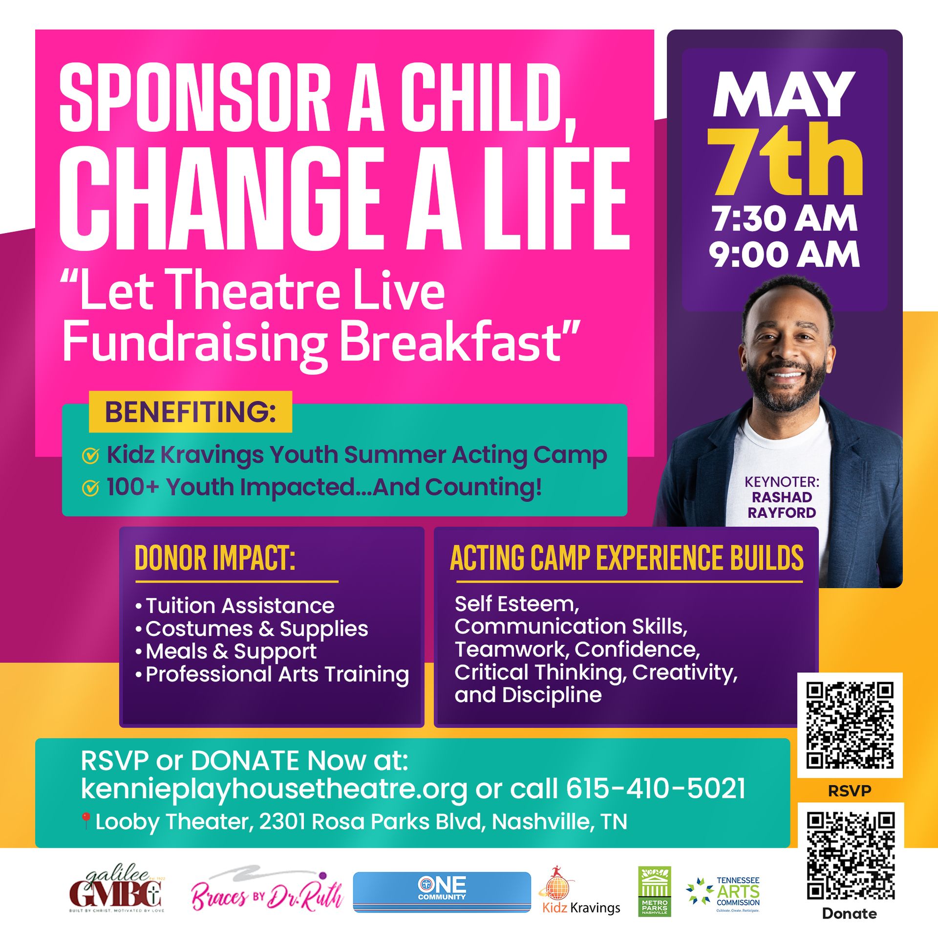 We invite you to join us for a powerful morning of purpose and impact at the “Let Theatre Live” Fundraising Breakfast on May 7th from 7:30 AM – 9:00 AM at the Looby Theater in Nashville. This special event supports the Kidz Kravings Youth Summer Acting Camp, where over **100 youth—and counting—**are being impacted through an experience that goes far beyond the stage.